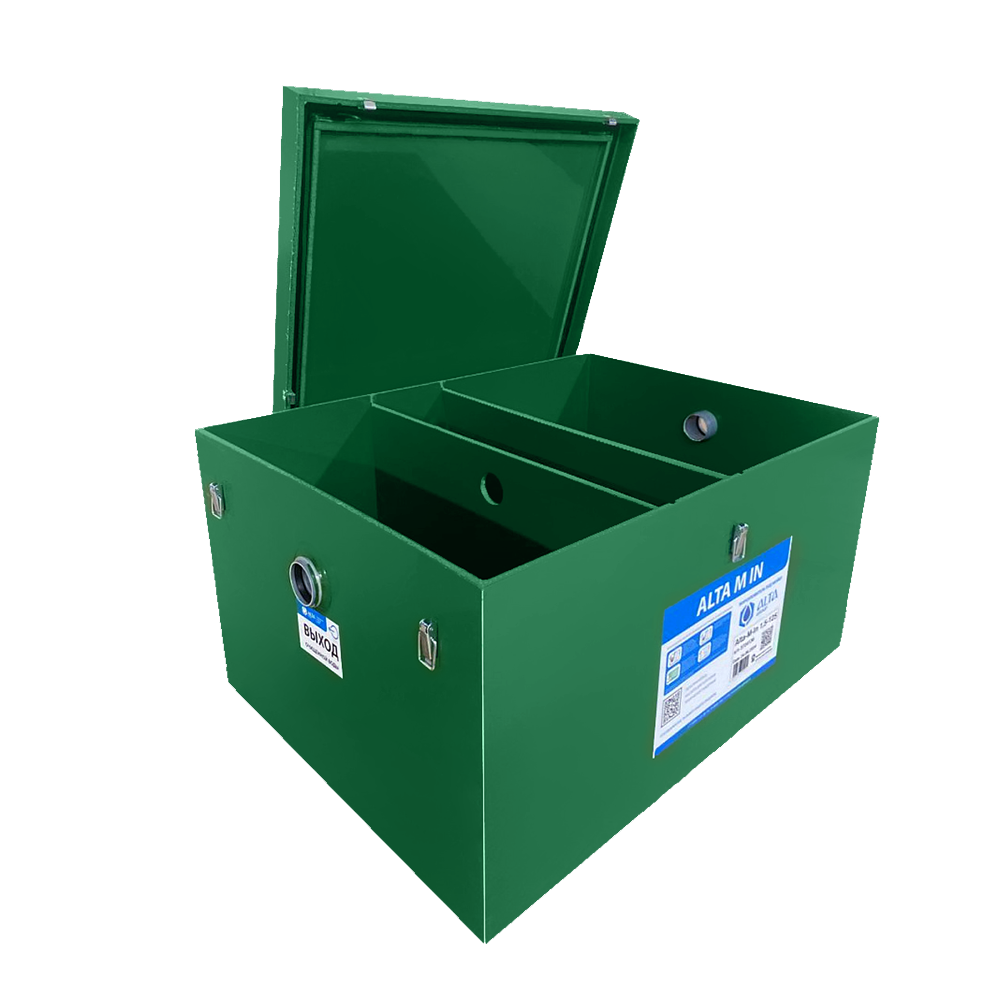 Жироуловитель под мойку Alta M-In 1.5-125 изготовлен из пищевого пластика. В соответствии с санитарно-эпидемиологическим заключением №77.01.03.485.П.014961.03.10 от 16.03.2010г., жироуловитель Alta M-In 1.5-125 разрешено устанавливать непосредственно в помещении кухни предприятий общественного питания.
